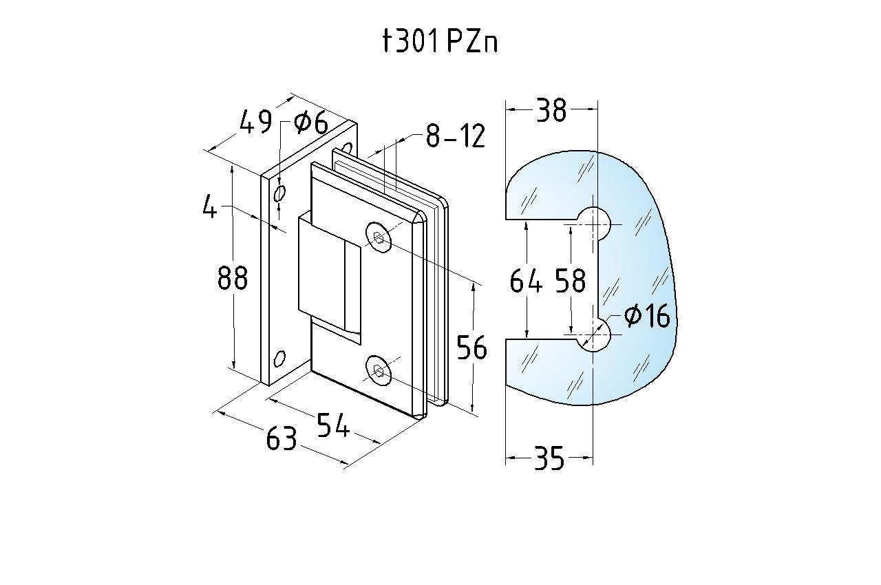 Петля стена-стекло для соединения стеклянной двери душевой кабины со стеной ванной комнаты. Двухстороннее крепление позволяет устойчиво закрепить петлю на стене и уверенно открывать и закрывать дверь в обе стороны. Максимальный угол разведения стыковочных элементов в плане составляет 90°. Масса двери может составлять 35 кг на две петли.