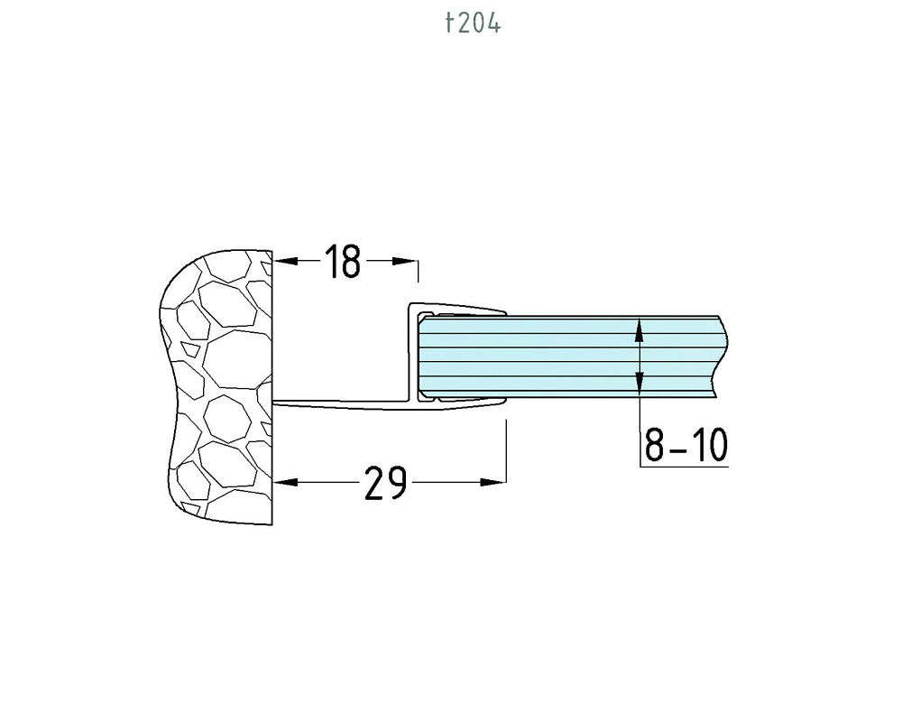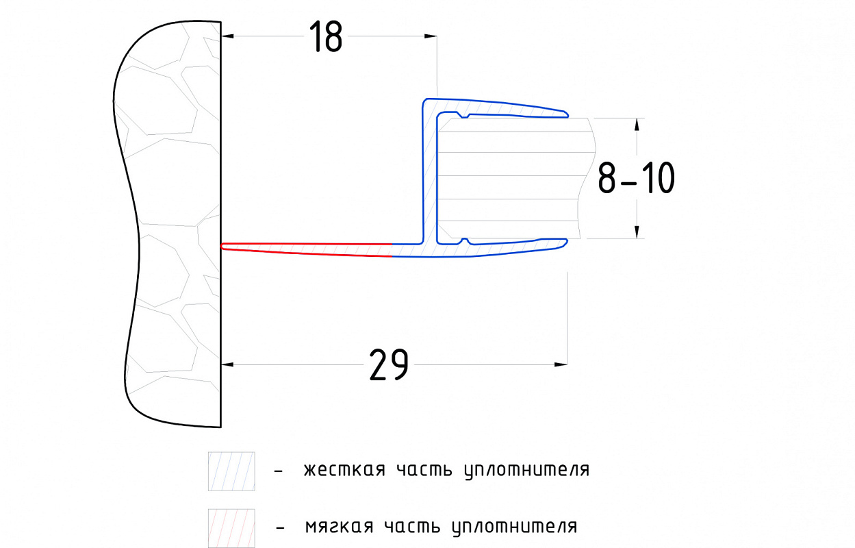 Уплотнитель имеет исполнение черной полупрозрачной поверхности, выполнен из материала ПВХ. Имеет Ч-образный профиль. За счет своих свойств (стойкость к щелочам, минеральным маслам и многим кислотам) прекрасно подходит для крепления стеклянного листа по всему периметру. Позволяет соединять стеклянные панели между собой.