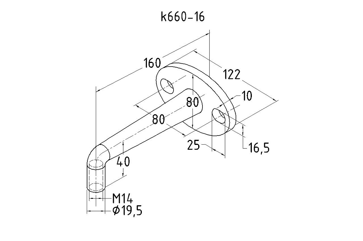 Держатель рутеля к стене стеклянного козырька. Литая, полированная деталь, выполненная из стали AISI 316. Состоит из фланца толщиной 10 мм и шириной 80 мм и дистансера с резьбой М14. Размер дистансера 160 мм от стены до центра отверстия. В основании имеется два овальных крепёжных отверстия размером 16,5 на 25 мм.