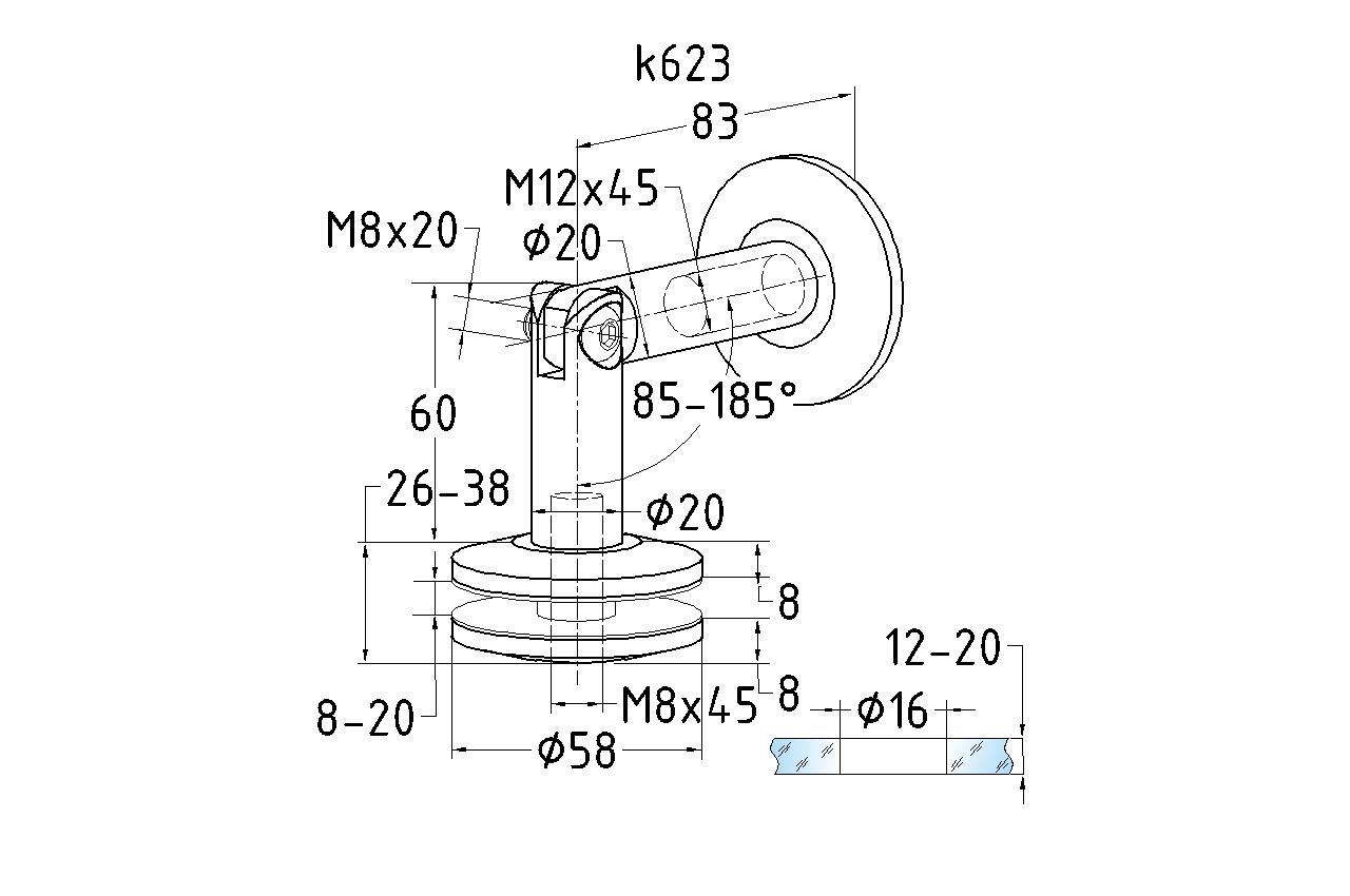 предназначен для крепления стекла к стене путем монтажа детали на шпильку М12 в стену и последующим креплением стекла от 10 до 20мм.