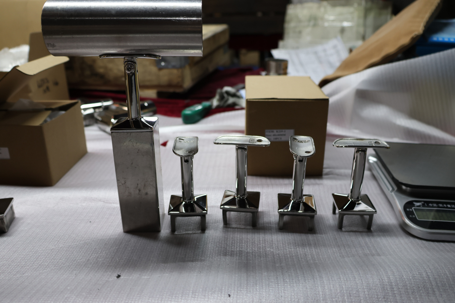 Наконечник палец на стойку из профильной трубы диаметром 40х40 мм, с регулируемым ложементом под поручень Ø50.8 мм. Деталь полированная, литая, облегченная нержавеющая. Марка стали - AISI 304