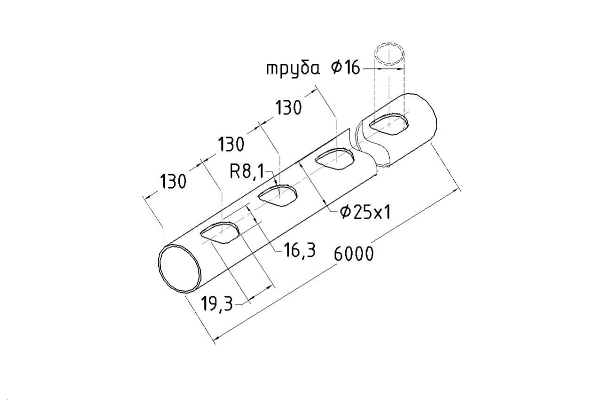 В конструкции предусмотрены овальные отверстия. Марка стали: AISI 304 — устойчива к коррозии, подходит для эксплуатации в условиях повышенной влажности. Размеры: 25 мм (наружный диаметр) × 1 мм (толщина стенки) × 6000 мм (длина). Перфорация: отверстия Ø16 мм с шагом под углом 30°. Обработка поверхности: GRIT 600 — полированная.