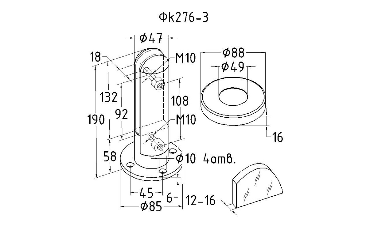 Держатель крепится в пол на 4 анкера или шпильки. Для этого предусмотрено 4 отверстия диаметром 10-12 мм. Стекло зажимается в стеклодержатели с помощью двух фиксирующих винтов, количество уплотнителей варьируется. В зависимости от толщины стекла может потребоваться дополнительный винт. Высота ограждения должна быть не более 1200 мм от пола. Если по проекту предусмотрен поручень, то мы рекомендуем использовать трубу с пазом прямоугольного сечения 60х40 (k824-4, k824-2, k824-5 ) или круглого сечения ф48( k822-3) и ф42 (k820-3