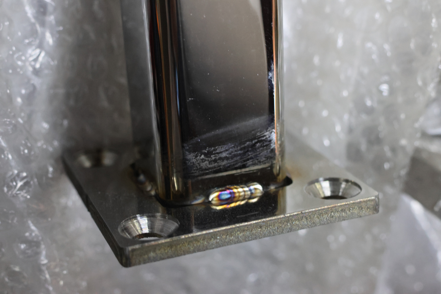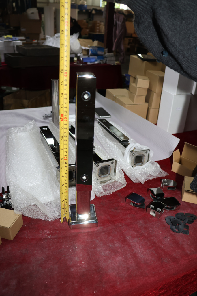 Стойка крепится к полу через отверстия в фланце диаметром 9 мм (4 шт), крепеж выбирается в зависимости от поверхности на которую необходимо смонтировать деталь. Для бетона, это шпилька 8 мм, для дерева, это всевозможные саморезы , которые выбираются в зависимости от толщины породы. Затем устанавливается стекло, через отверстия диаметром 16 мм и фиксируется прижимной пластиной с помощью шестигранника