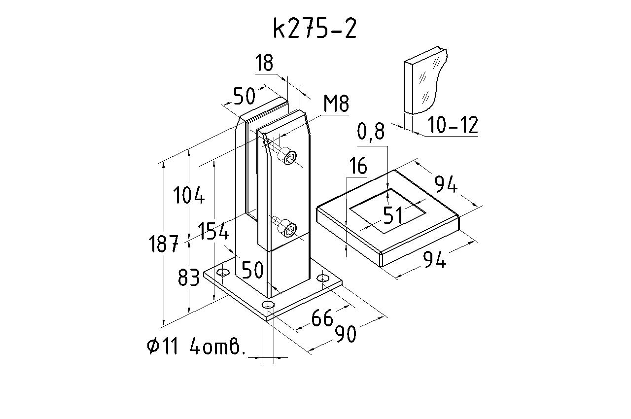 Стеклодержатель напольный 50х50х190 мм, литой, плоский, для стекла 10-12 мм, нержавеющая сталь AISI 304, полированная k275-2 купить в Перми