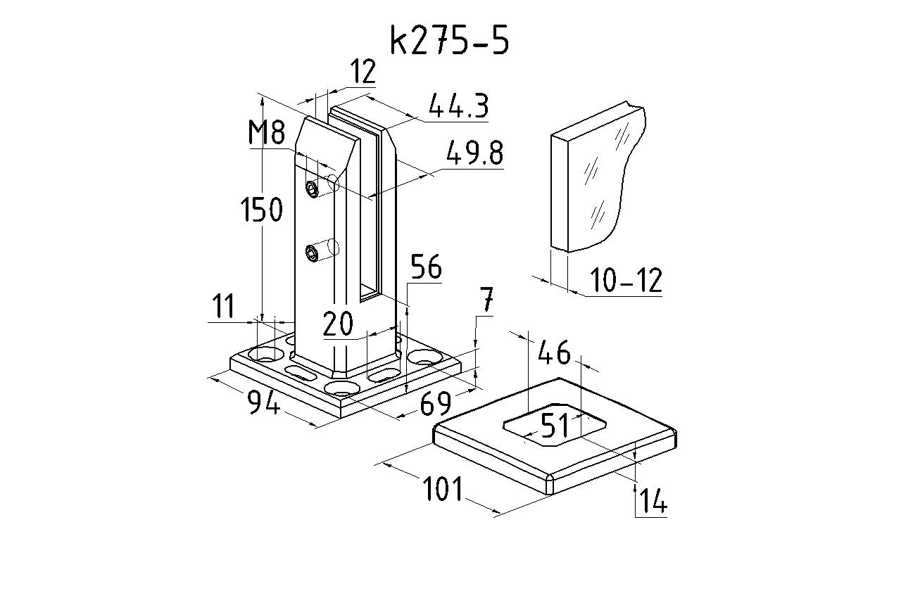 Cтеклодержатель напольный, плоский 45х50х160 мм, для стекла 10 - 12 мм, полированный, без сверления стекла AISI 201 k282-201