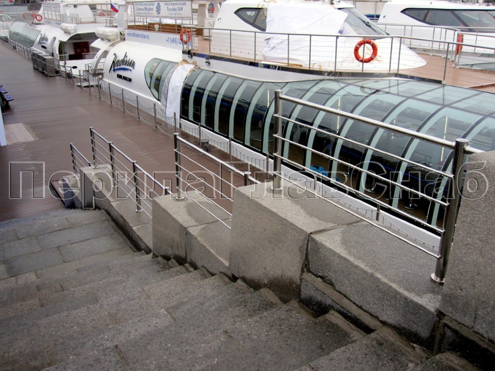 Вдоль набережной причала «Рэдиссон Ройал» было установлено многоуровневое ограждение из полированной нержавеющей стали на усиленных круглых стойках с четырьмя ригелями параллельно поручню, специально для этого проекта смещенному с верхней точки стоек на несколько сантиметров вниз, в целях придания уверенной солидности внешнему виду конструкции.