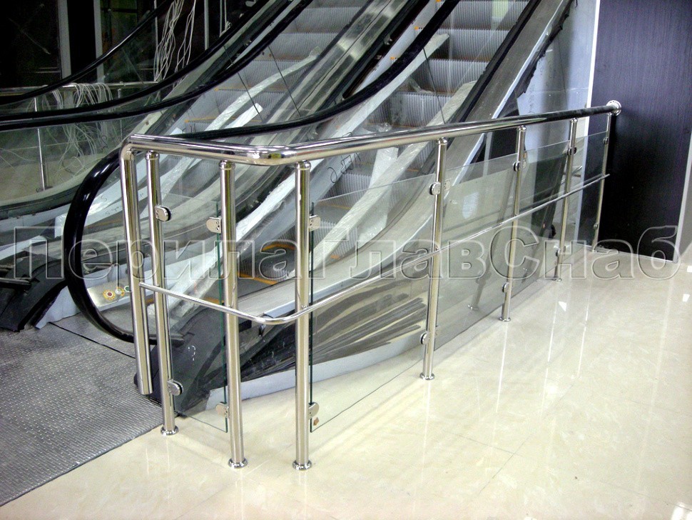 Стеклянное ограждение эскалатора торгового центра с дополнительным отводом поручня для защиты движущихся частей и механизмов