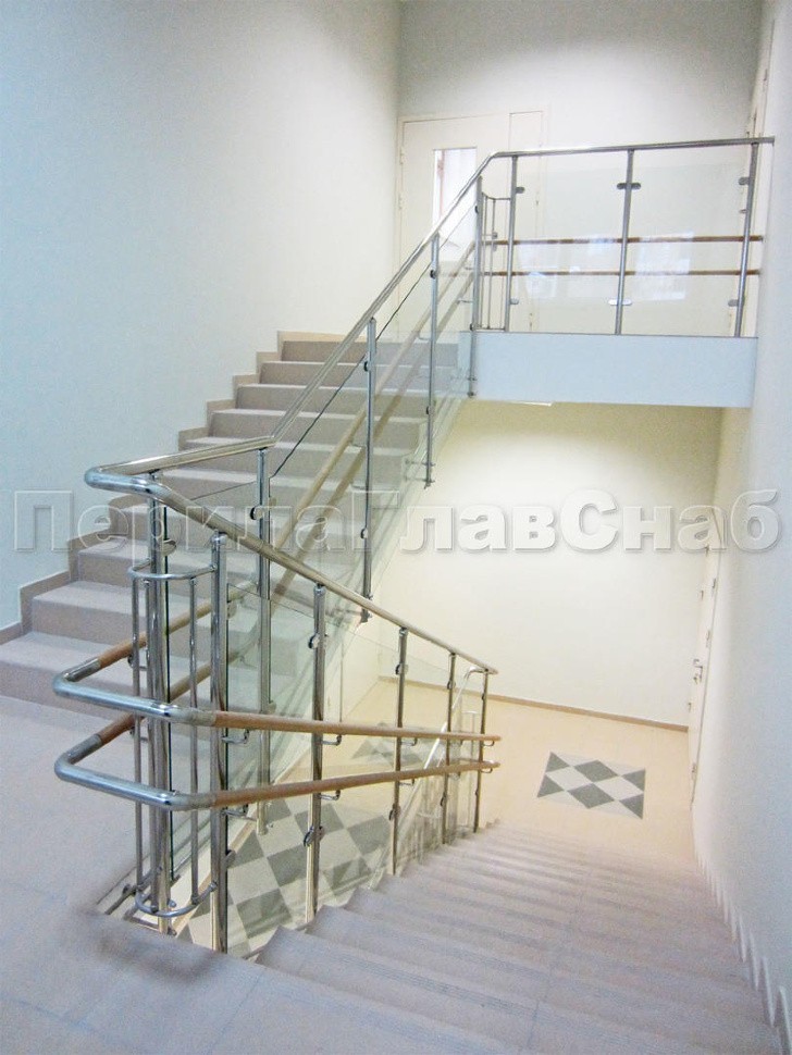 Ограждение со стеклом (на зажимных стеклодержателях) и стойками. Стойки установлены в торец ступеней. Поручни завязаны на поворотах.