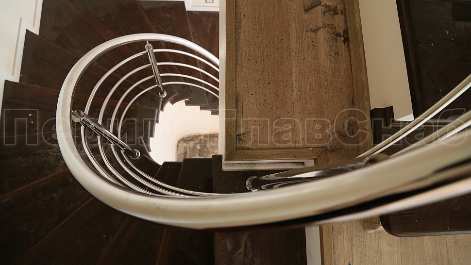 Заказчиком был одобрен предложенный нашими специалистами проект. Ограждение винтовой лестницы с первого по четвертый этаж выполнены из полированной нержавеющей стали с четырьмя ригелями, высотой 950 мм. Стойками диаметром 38,1 мм, низ стойки декоративный, ригель диаметром 16 мм, поручень полированная нержавеющая сталь диаметром 38,1 мм. Стойки устанавливаются в ступени с маршем сверху сквозь доску, фанеру в железобетон на шпильке с вклеиванием с шагом через две ступени на третью, в горизонте с шагом 900 -1200 мм.