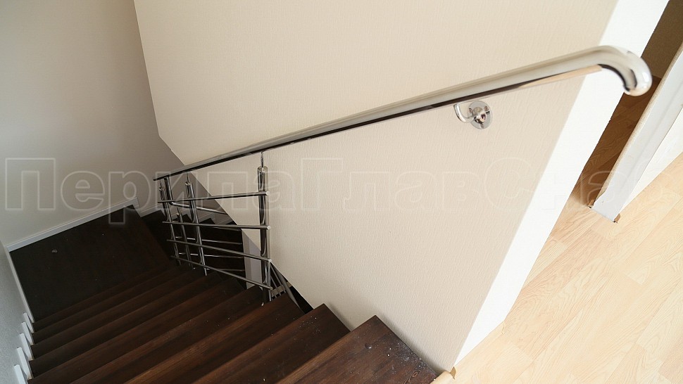 Поручень диаметром 38,1 мм из прямых и радиусных участков прокатанных по месту на станке ( при прокатке поручень приобретает в сечении овальную форму). Крепление нержавеющих элементов ограждения между собой выполнено при помощи точечной аргонно-дуговой сварки, длина швов после нее — 2 мм, на финальном этапе монтажа швы были зачищены и отполированы.