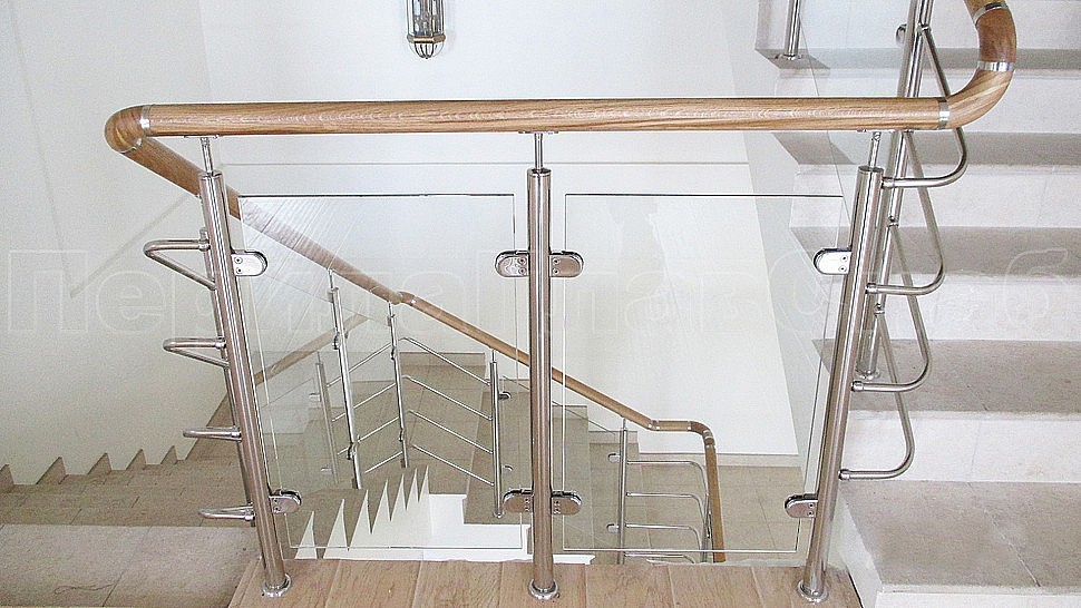 Клееный дубовый поручень, без тонировки покрытый лаком в один слой крепится над стойками. Окончание поручня заглушка из полированной нержавеющей стали. Поручень крепится к держателю поручня на саморезах с полукруглой головкой. Поручень завязан между маршами дубовыми отводами через нержавеющие кольца с круглыми проставками из дуба. Между маршами (на повороте 90 градусов) внахлест на стойки привариваются снизу по четыре ригеля – трубки из полированной нержавеющей стали с забивными заглушками.
