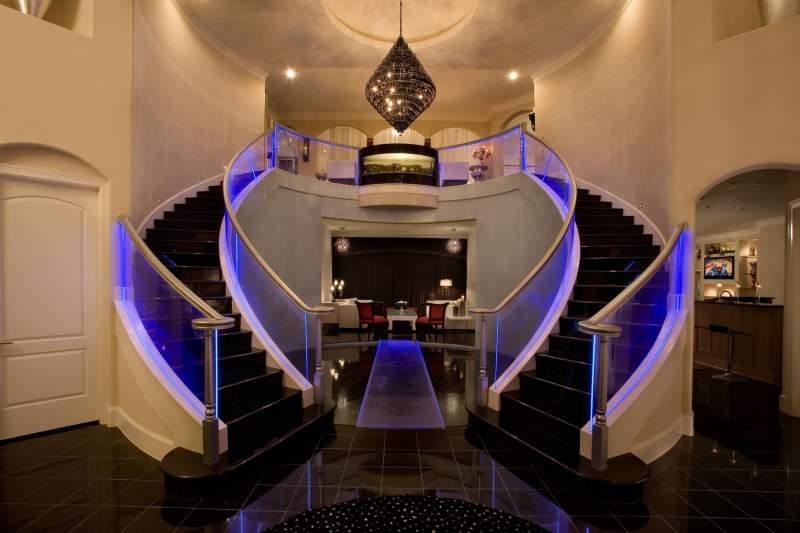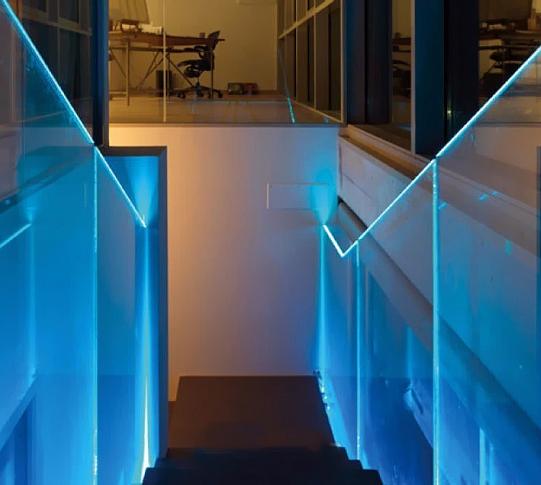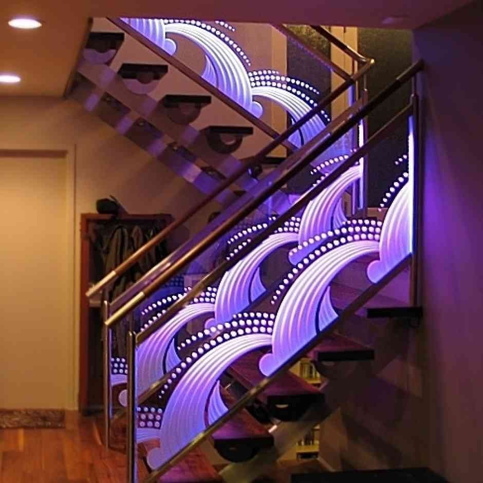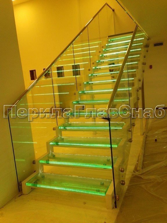 Хорошее практическое применение дает подсветка в дополнительном выносном поручне. В таком виде подсветки хорошо освещаются как поручень и стекло, так и ступени или внутреннее пространство, огражденное стеклом. Очень часто различные виды размещения комбинируют, например, используют подсветку в профиле и подсветку в дополнительном поручне.