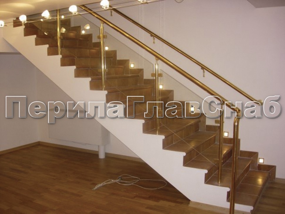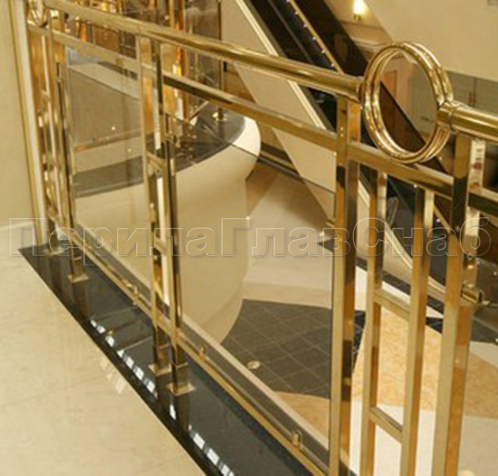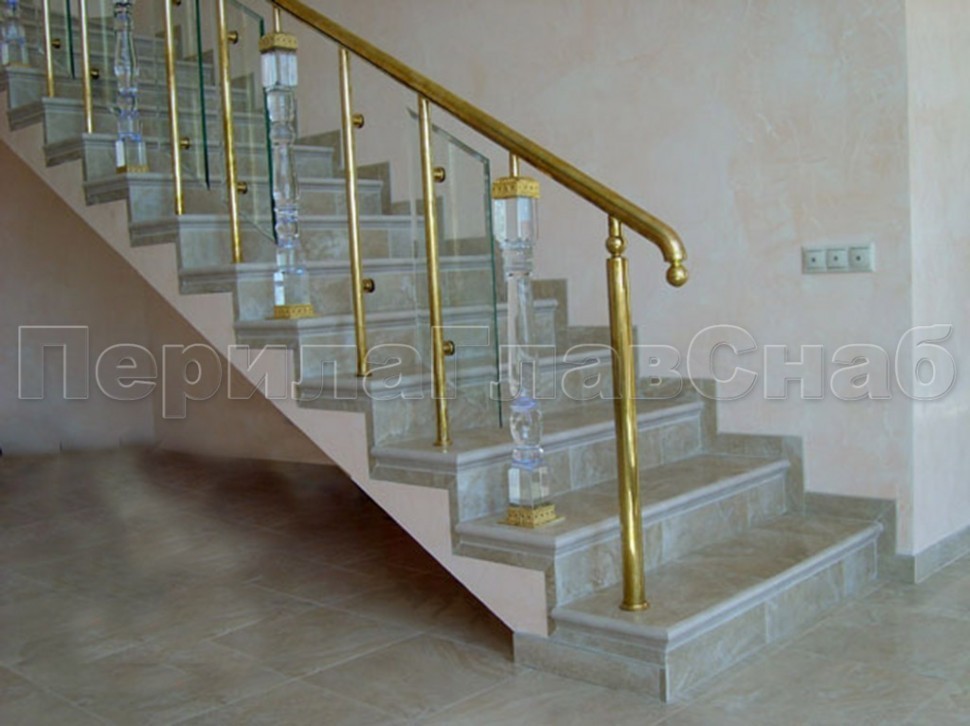 - Ограждение лестницы со стеклом, тонированным в массе, стойки и завязки поручня из латуни