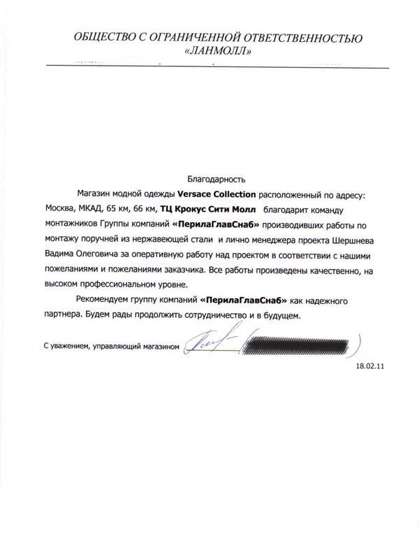 благодарит команду монтажников Группы Компаний «ПерилаГлавСнаб», производивших работы по монтажу поручней из нержавеющей стали