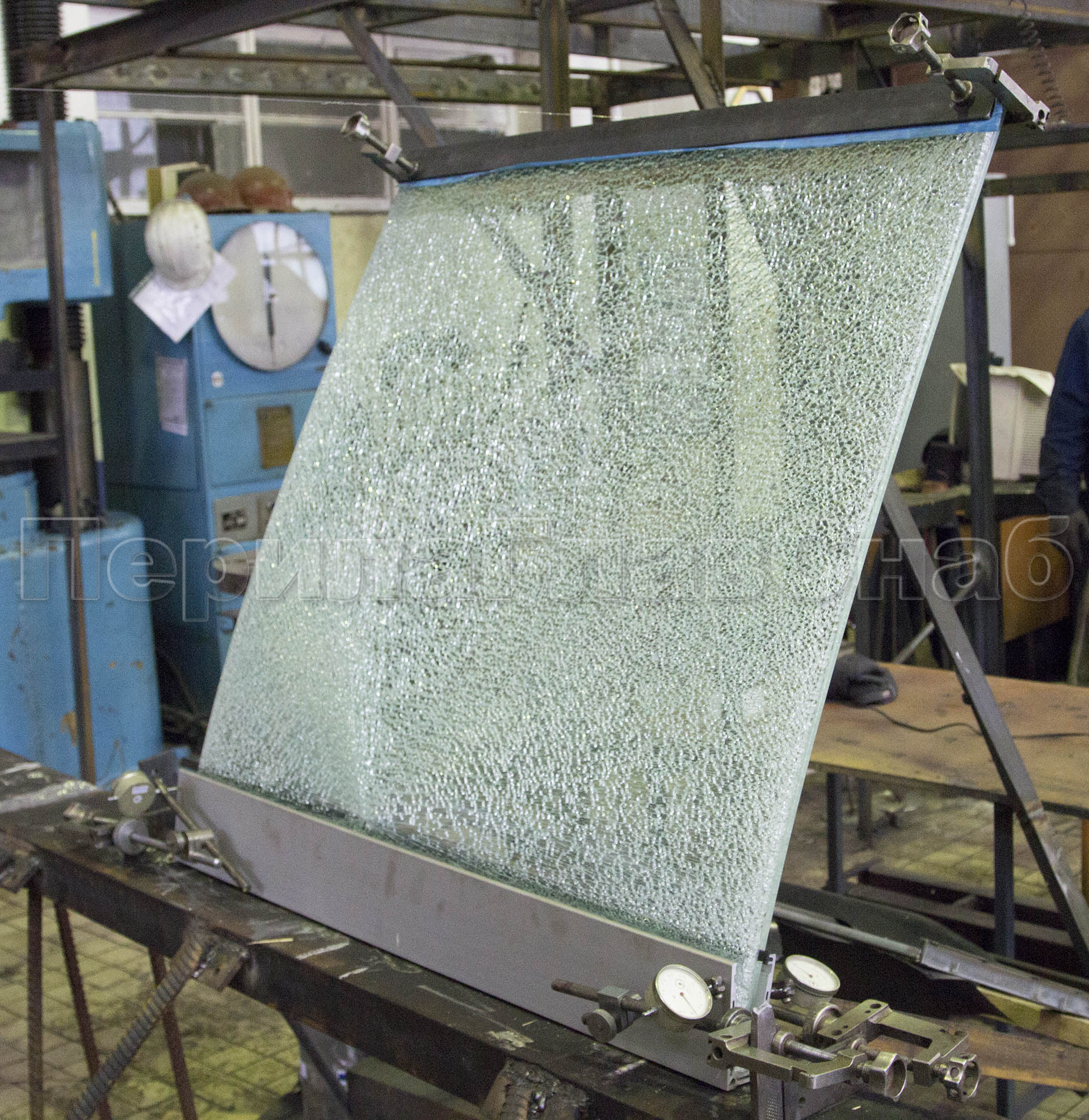 Нагрузка прилагалась к верней кромке стекла. При проведения эксперимента использовались: динамометр ДОУ -3-20И; прогибомер 6ПАО; индикаторы часового типа ИЧ-10. Испытания проводились 20 мая 2015 года в лаборатории ИЦ "ЦНИИС-ТЕСТ".