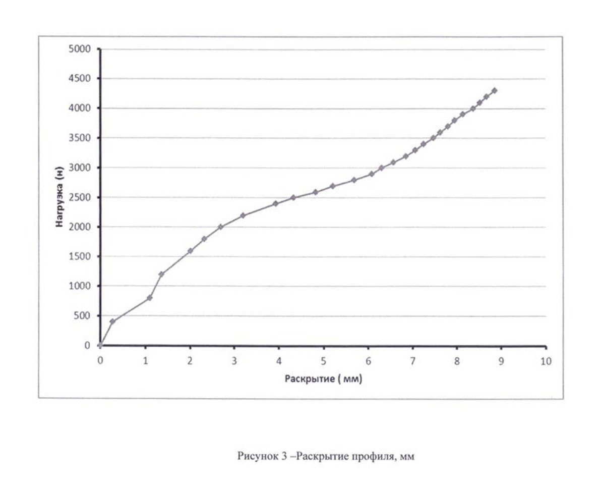 Профиль выдерживал все приложенные нагрузки и при приложении горизонтальной силы 4300 Н произошло разрушение одного из стекол триплекса (растянутого стекла). Сжатое же стекло триплекса не лопнуло. Следует отметить, что стекло сохранило свою форму и не обрушилось осталось стоять в профиле. После снятия нагрузки стекло вернулось практически в начальное состояние. Профиле вернулся к начальному раскрытию, практически не имея деформаций.